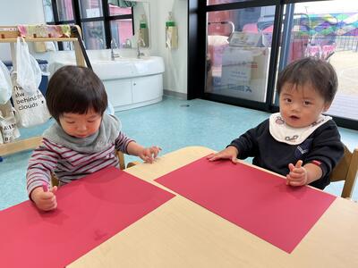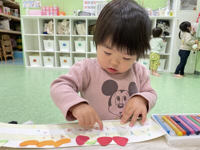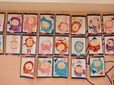 うみチームの子ども達もだるまに変身!自分の顔を見つけるとにっこり嬉しそうです♪