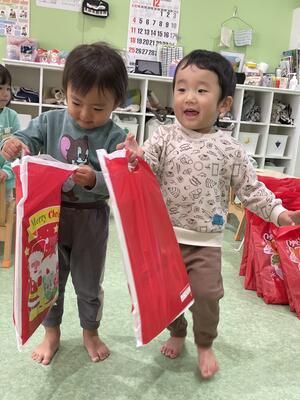 びっくりして保育士等の背中に隠れる子もいましたが、サンタさんにギュー♡と抱きつく子も!