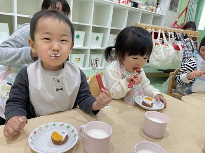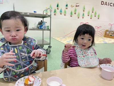 午後のおやつはクリスマスケーキ!制作したケーキと「いっしょだね!」「おいし〜!」と言いながらパクパク食べていました!