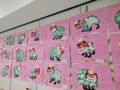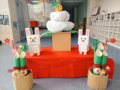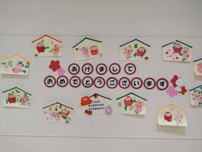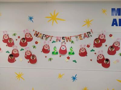 卯年にちなみ、うみチームのみんなのかわいい足形がうさぎの耳に、ぐるぐるなぐり描きを楽しんだ画用紙がだるまの体になり、素敵な飾りが完成しました♡